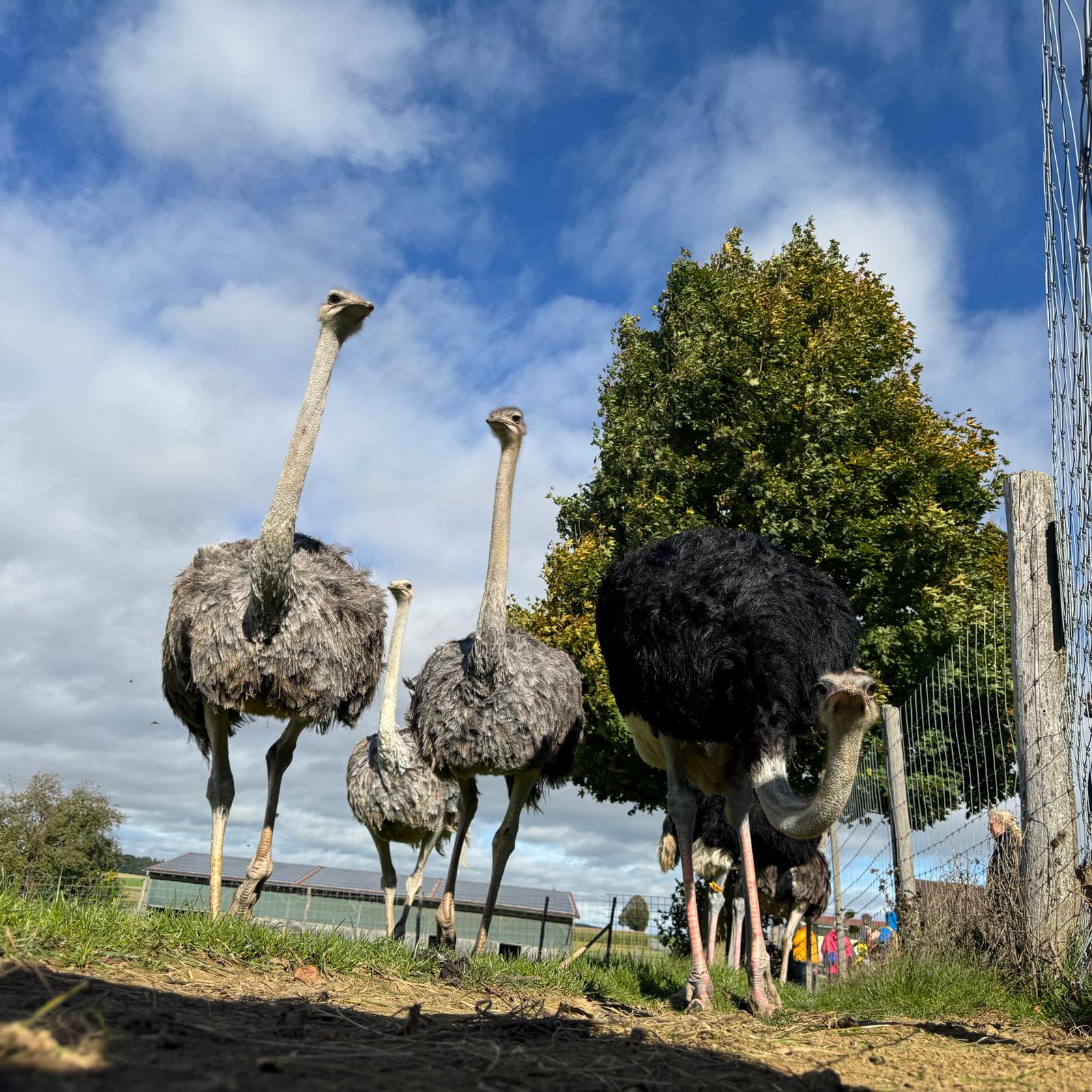 Im Rahmen des N-A-N-U-Projekts organisierte die Ortsgruppe Aichtal des Schwäbischen Albvereins am 4. Oktober 2025einen Ausflug zur Straußenfarm Bosch in Böhmenkirch. Schon beim Eintreffen waren die riesigen Vögel ein beeindruckender Anblick – und nicht nur die Erwachsenen, sondern auch die Kinder hatten ihren Spaß und staunten nicht schlecht, als sie den größten Vogel der Welt aus nächster Nähe erleben durften.