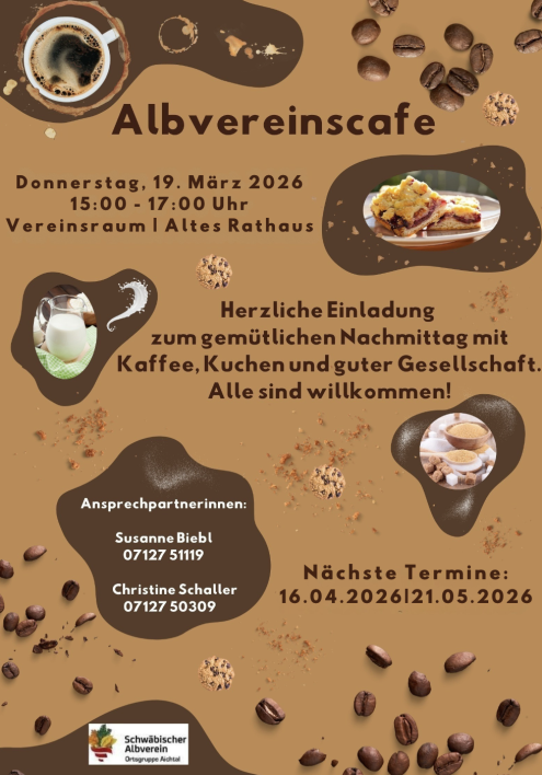 Albvereinskaffee Do., 19.03.2026, Uhrzeit: 15:00 - 17:00 iCalendar Mit dem Laden der Karte akzeptieren Sie die Datenschutzerklärung von Google.Mehr erfahren Karte laden Google Maps immer entsperren zur Übersicht