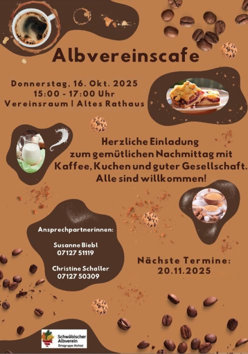 Albvereinskaffee Do., 16.10.2025, Screenshot Uhrzeit: 15:00 - 17:00 iCalendar Mit dem Laden der Karte akzeptieren Sie die Datenschutzerklärung von Google.Mehr erfahren Karte laden Google Maps immer entsperren zur Übersicht