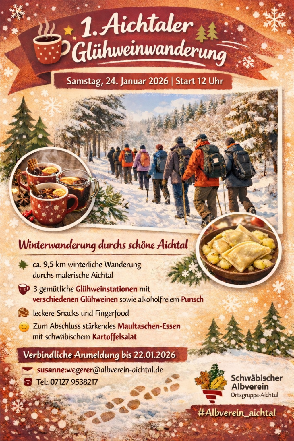 Zum ersten Mal laden wir euch herzlich zur Aichtaler Glühweinwanderung ein! Gemeinsam entdecken wir das schöne Aichtal zu Fuß – begleitet von aromatischem Glühwein, duftendem Punsch und vielen kleinen Leckereien.