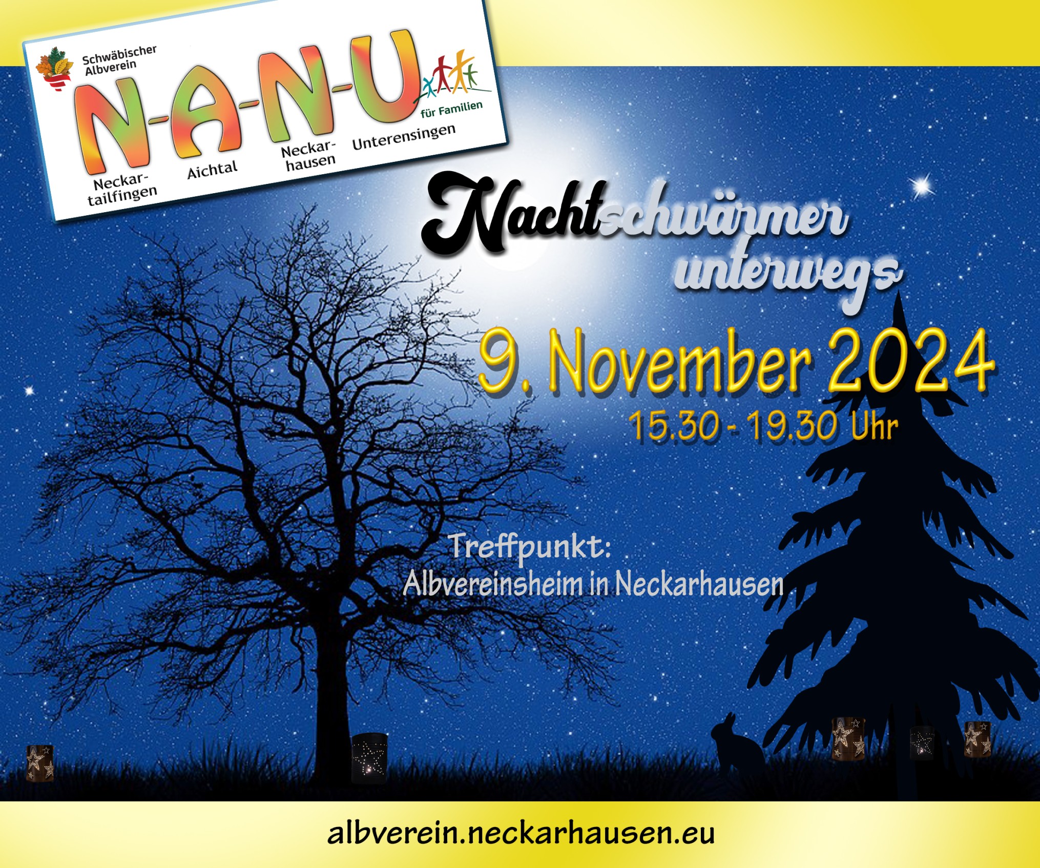 Ihr habt Lust auf eine Mischung aus Basteln, Nachtwanderung und Abendsnack am Lagerfeuer? Dann seid Ihr bei dieser Aktion genau richtig. Wir werden kleine „Nachtschwärmer“-Laternen basteln, die uns bei der anschließenden Runde im Dunkeln den Weg leuchten. Wieder zurück am Albvereinsheim lassen wir den Abend am Lagerfeuer bei Punsch und Grillwürstchen am Stock ausklingen.