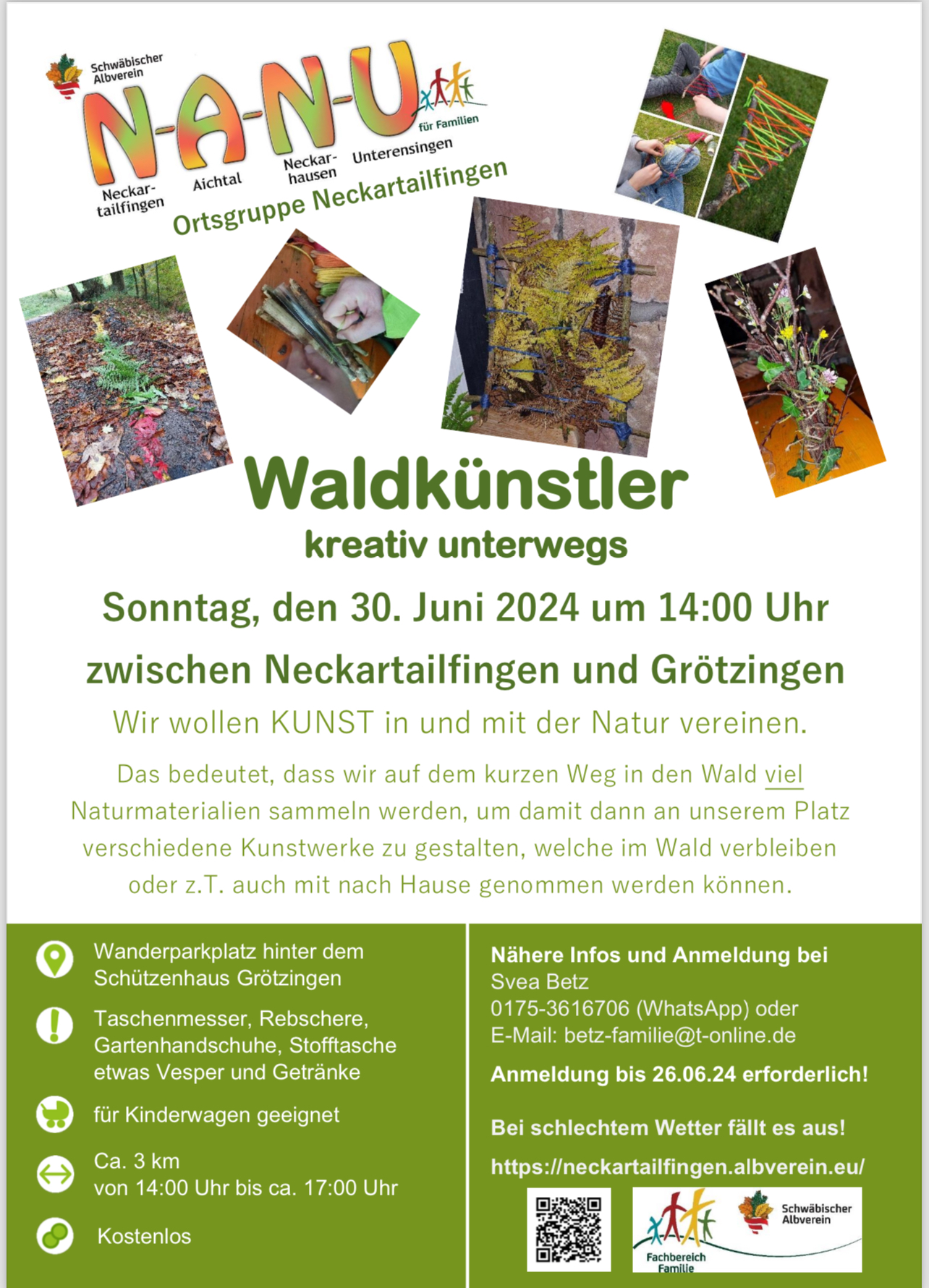 Am Sonntag, den 30. Juni 2024 von 14:00 Uhr bis ca. 17:00 Uhr möchte ich mit möglichst vielen FamilienKUNST in und mit der Natur vereinen.