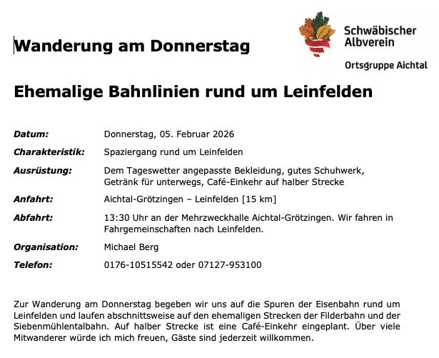 Wanderung am Donnerstag Do., 05.02.2026, Uhrzeit: 00:00 iCalendar Mit dem Laden der Karte akzeptieren Sie die Datenschutzerklärung von Google.Mehr erfahren Karte laden Google Maps immer entsperren zur Übersicht